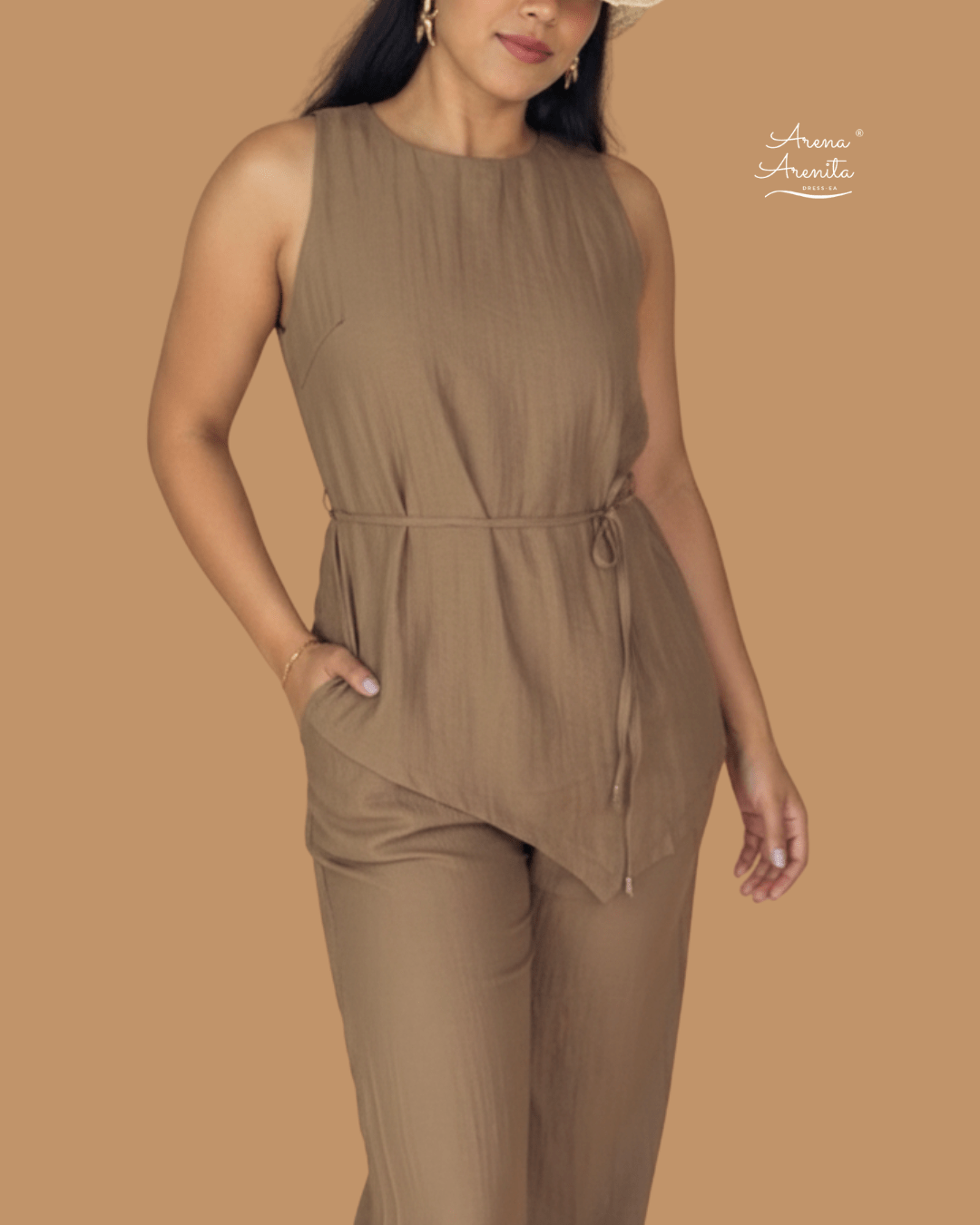 CONJUNTO DE CAMISA DE SIN MANGAS Y PANTALÓN CON BOLSAS Y RESORTE.