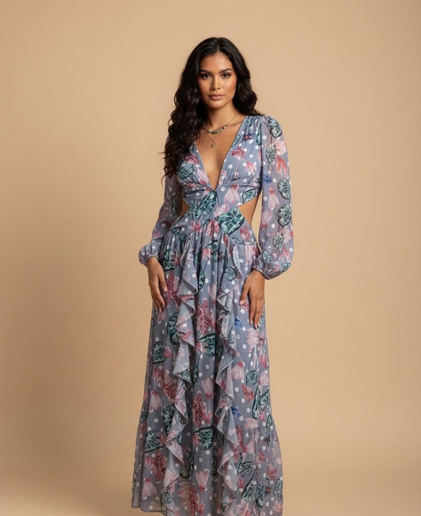 VESTIDO LARGO DE PLAYA CON MANGA LARGA, Y CON LA CINTURA DESCUBIERTA.
